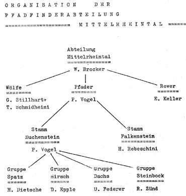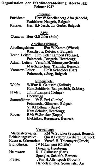 Am 5. Februar wird die Abteilung Heerbrugg an der Delegiertenversammlung in den Kantonalverband aufgenommen. Kurz darauf orientieren Abteilungsleiter und Elternrat die Öffentlichkeit über Ziel und Wesen der Pfadfinderbewegung. Sie erhoffen dadurch, ein gutes Verhältnis zur rheintaler Bevölkerung zu schaffen, die den Pfadfindern noch mit Vorsicht gegenüberstehen. Vor allem Turnerkreise versuchen sogar, das Aufkommen der Pfadfinder zu unterdrücken. Trotzdem besuchen einige Knaben die Übungen und schon nach wenigen Samstagnachmittagen setzt sich die neugegründete Abteilung wie folgt zusammen: