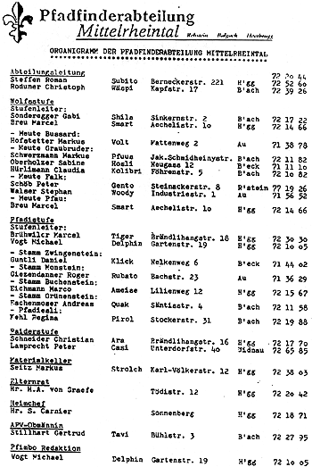 - Pfader: vier Fähnli Adler, Wiesel, Biene und Hirsch mit je sieben Pfadern